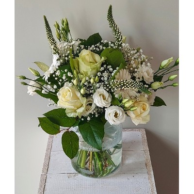 GEMENGD WIT BOEKET, NIET BESCHIKBARE BLOEMEN WORDEN VERVANGEN DOOR GELIJKAARDIG ALTERNATIEF